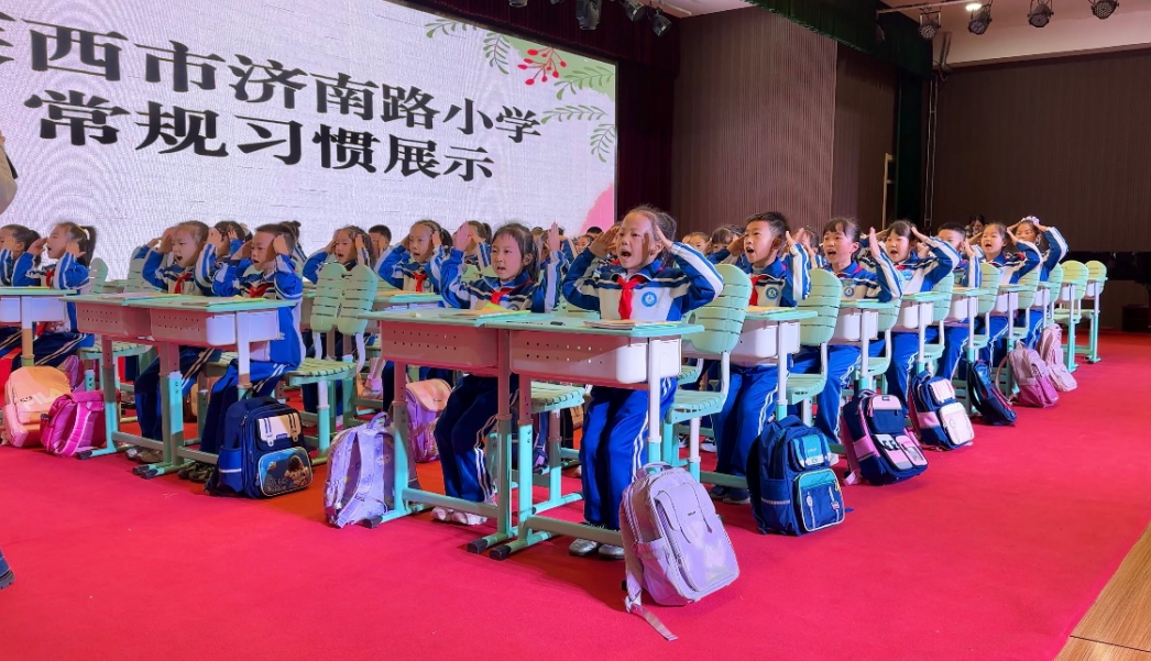 “习惯润行”实景展示环节,二年级学生依次展示课前演讲、课堂学习、课后整理等全流程习惯养成表现,师生口令互动有序,学生精神昂扬,既精准掌握课堂上下的行为规范,也深化了对学校规则的敬畏意识。