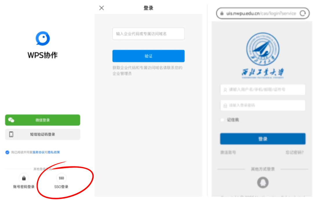 步骤二:打开WPS协作,选择“sso登录”;输入学校代码【nwpu】点击验证;使用学工账号即可登录使用。