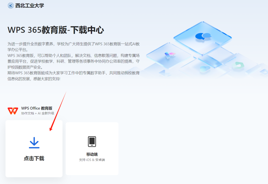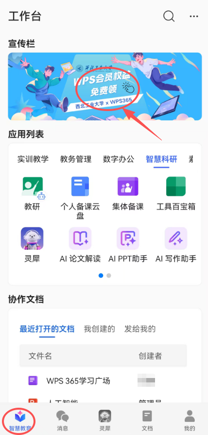 登录WPS协作,点击下方【智慧教育】,点击宣传栏中图片跳转至权益领取页面,即可领取。