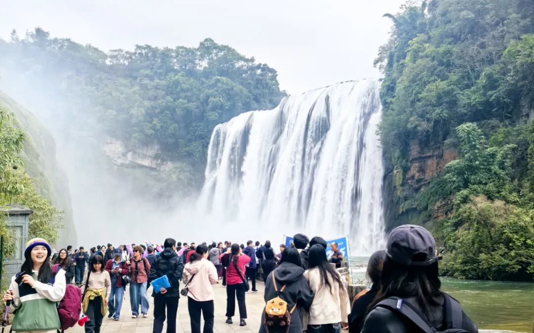 初冬时节,黄果树大瀑布褪去盛夏的磅礴奔涌,尽显清灵秀逸的独特气韵。虽寒意渐生,但观景台前依旧人头攒动,飞瀑轰鸣与游客赞叹交织回荡,冬日里的文旅热度丝毫不减。