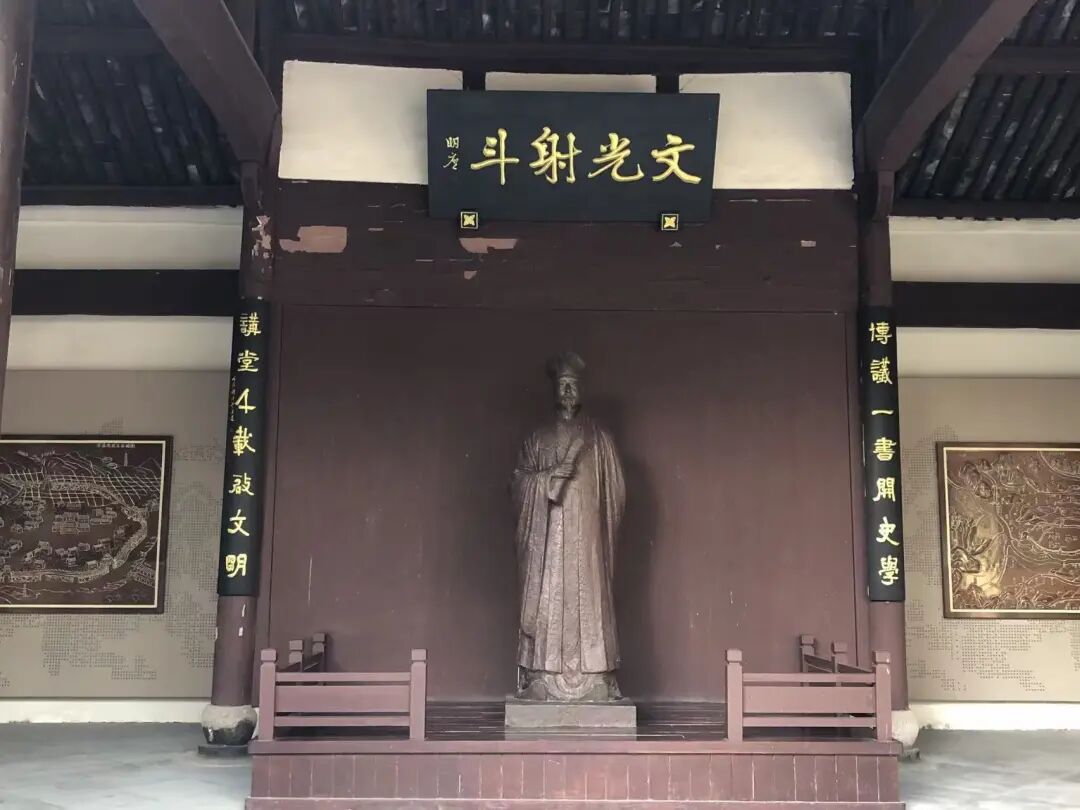 初冬的武义县明招山,天高云淡,丹枫正红。晨光穿过松林,洒在明招讲院静谧的庭院里。吕祖谦的塑像静立其间,手持书卷,目光温润,仿佛刚刚停下讲学,正凝望着这片文化浸润的土地。他的头顶,“文光射斗”的牌匾在光影中沉静生辉,仿佛在诉说着那段思想激荡的岁月。