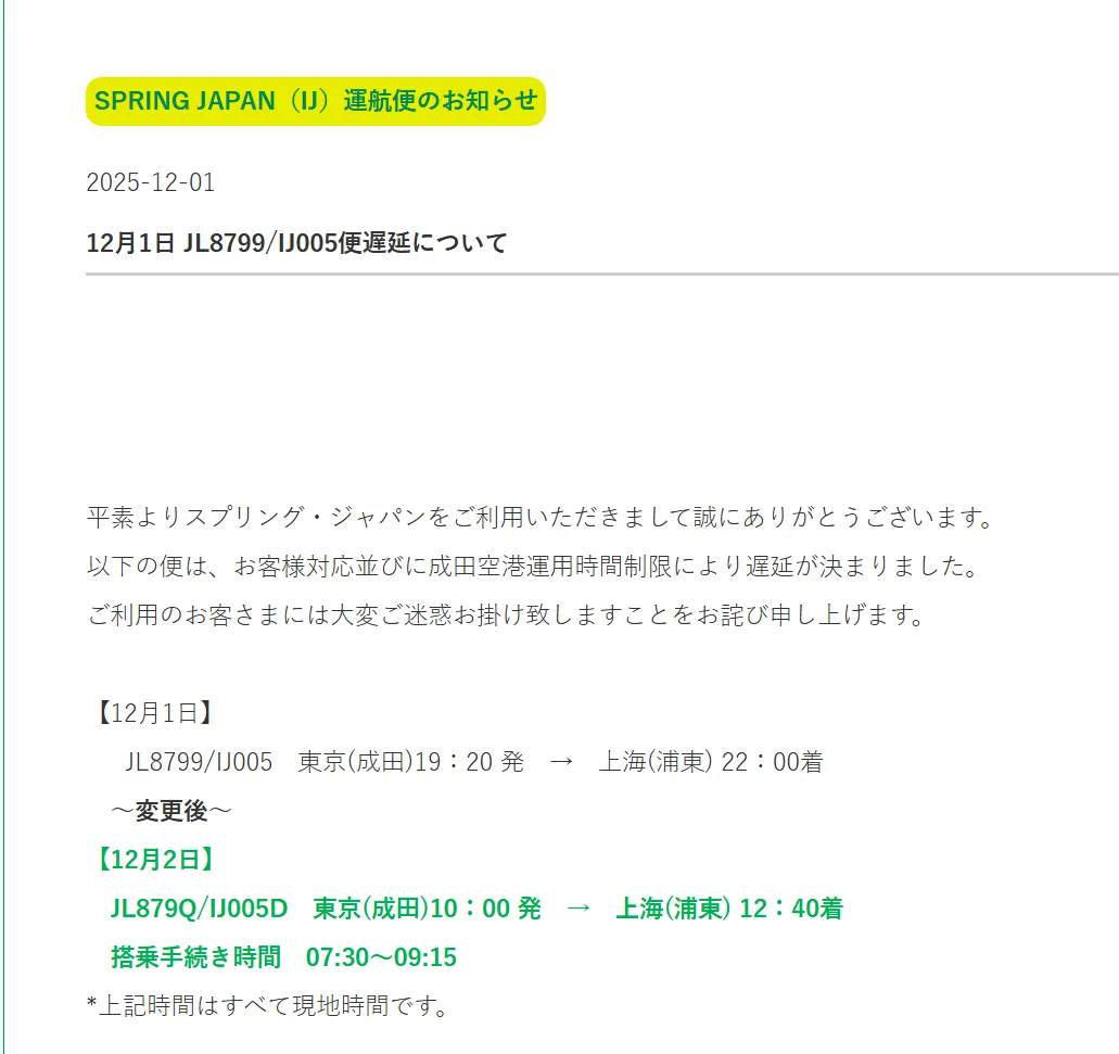 12月1日,春秋航空日本官网发布航班延误通知,原计划12月1日执飞的IJ005次航班,由于旅客服务以及受成田机场宵禁时间限制影响,春秋航空日本变更航班时刻,该航班计划12月2日日本时间10:00再次从日本东京飞往中国上海。