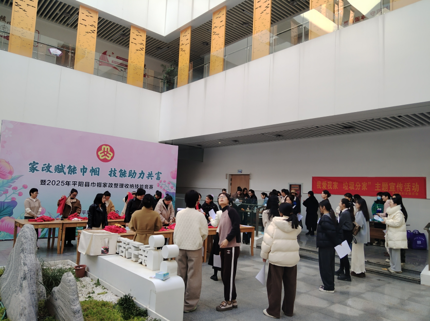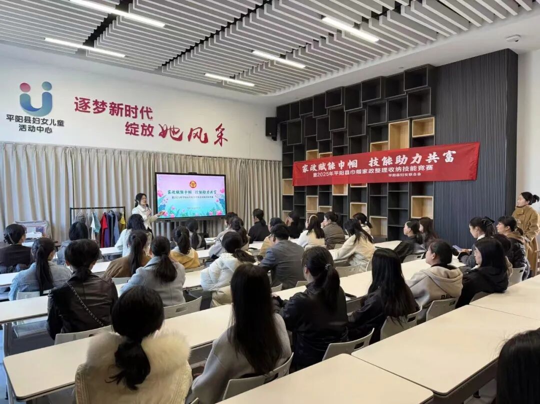 为深入贯彻《浙江省巾帼就业创业 “十百千万” 促进行动(2025—2027 年)实施方案》,拓宽妇女就业创业渠道,强化巾帼家政技能人才队伍建设,11月28日下午,由平阳县妇联主办的“家政赋能巾帼・技能助力共富”暨2025年平阳县巾帼家政整理收纳技能竞赛活动在县科技馆成功举办。来自全县的家政服务从业者、整理收纳爱好者、“巾帼共富工坊”代表等50余人齐聚一堂,以赛促学、以技赋能,在实操比拼中展现巾帼风采。