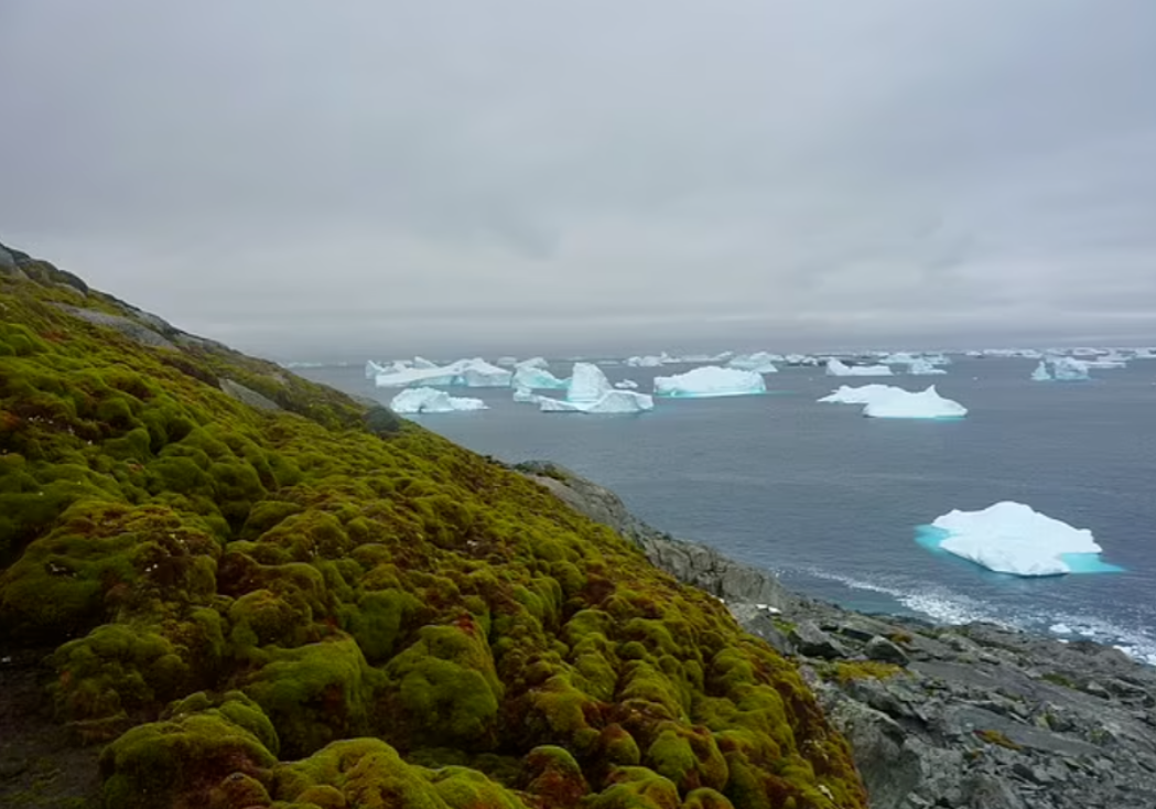 这些水藻是一种能够在寒冷环境中生长的单细胞植物。它们在冰雪表面形成一层绿色的覆盖物,尤其在春季和夏季,南极的气温略微上升时,水藻开始快速繁殖,形成一片片绿色的“冰雪田”。这种现象也反映了南极生态系统发生的一些微妙变化。