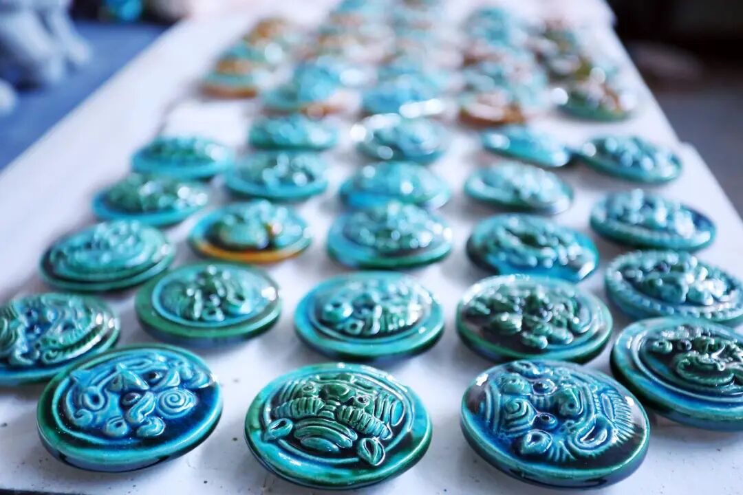 小巧的琉璃冰箱贴印着晋祠纹样
