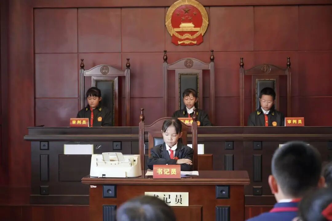 “现在开庭!”随着“审判长”敲响法槌,一场“校园打闹致残案”的庭审正式拉开序幕。“审判长”依法主持庭审,“书记员”认真详实记录,“原被告”条理清晰陈述案情,“诉讼代理人”逻辑严谨展开辩护、质证……同学们严格按照法定程序,完整呈现了庭审活动中的各个环节,每个人全情投入,真情演绎,“零距离”感受庭审氛围的同时,也接受了一次生动的法治教育,切身体会到司法公正和法律威严。