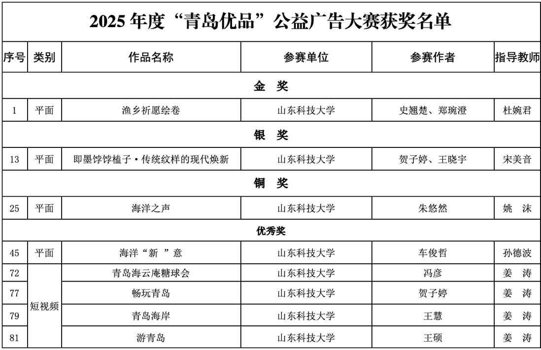 此次获奖,是山东科技大学艺术学院深化推进“以赛促学、以赛促教”人才培养育人模式的重要体现。山东科技大学艺术学院将以此为契机,进一步强化实践教学体系建设,鼓励更多师生在创新创造中成长成才,为培养高素质艺术设计人才、服务地方文化创意产业发展贡献更大力量。愿这份荣誉化为前行的星火,继续照亮山东科技大学艺术学院在创意设计与人才培养道路上的崭新篇章!