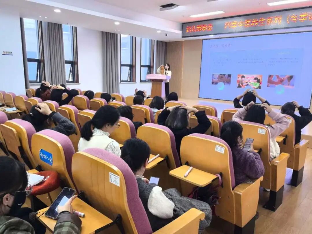 现场互动频频,当林医师问到“谁经常肩颈酸痛”时,学员纷纷举手。她演示了如何准确找到风池穴、肩井穴等穴位,并讲解了日常按压方法。学员们一边听讲,一边跟着寻找着穴位,按压片刻后就得到了即刻的放松。