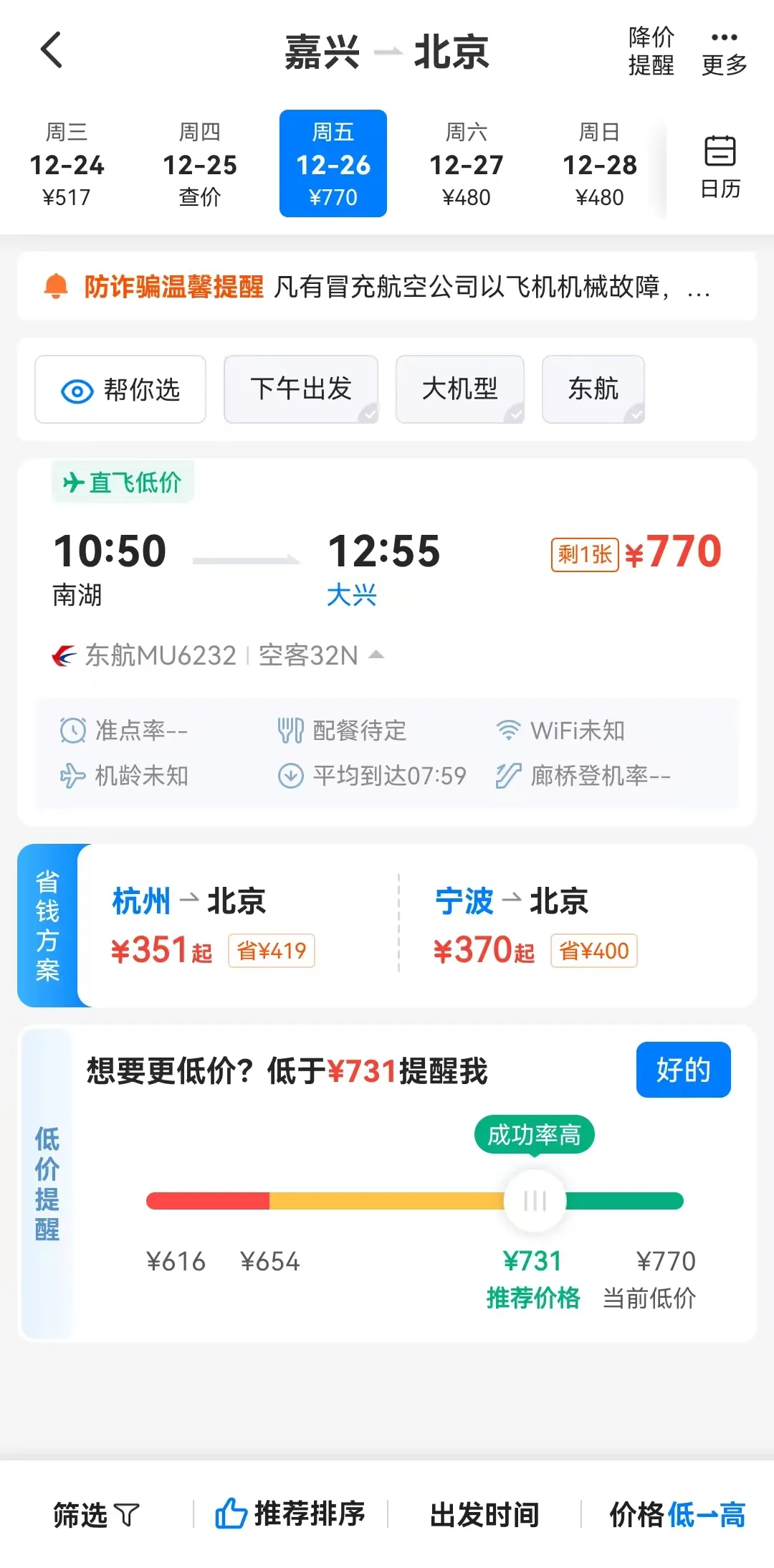 据订票平台显示,嘉兴南湖机场将于12月底首航,12月26日开通嘉兴至北京大兴的航线,有东航执飞,目前机票已经开售,余票紧张。