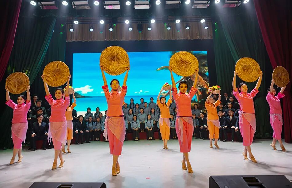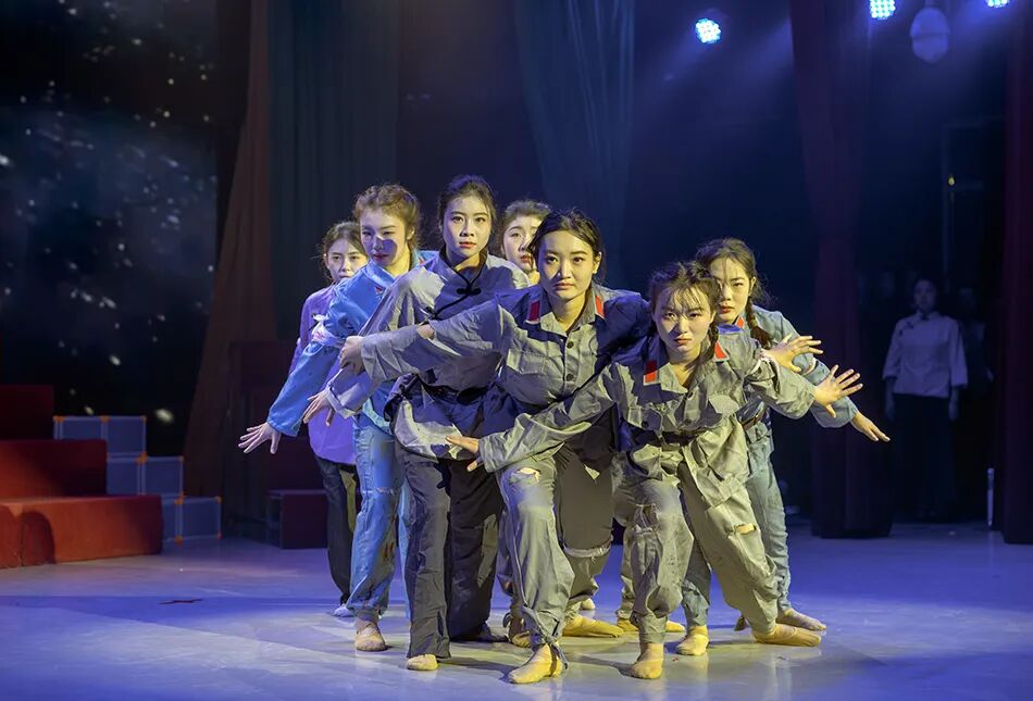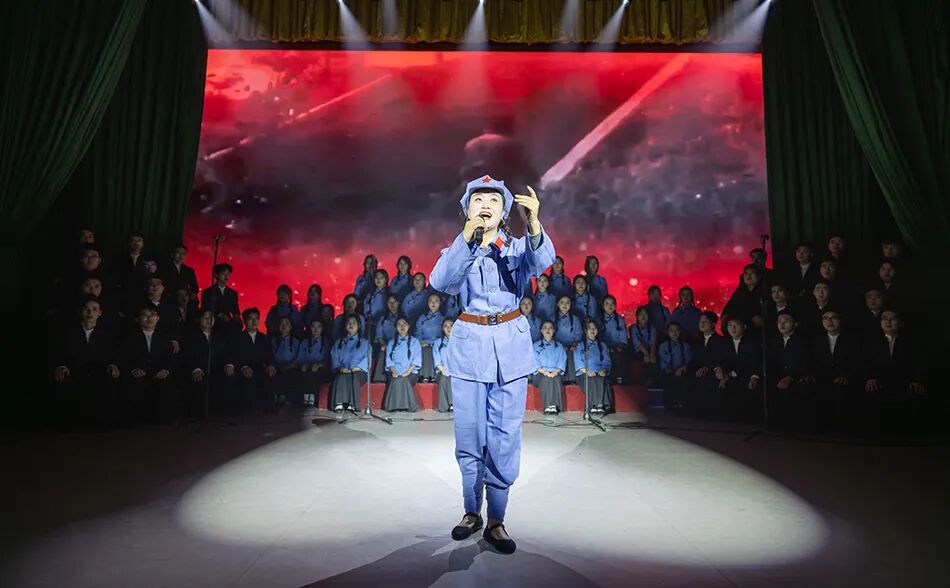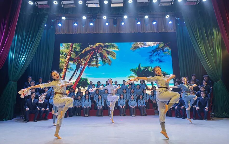 情境合唱《地道战》《太行山上》生动展现了华北军民在敌后战场中以智慧与顽强意志同侵略者展开斗争的光辉形象;舞蹈《红色娘子军》(选段)由王佳妮、王鹤云、吕路驰三位老师携手学生共同演绎,集中展示了琼崖纵队巾帼战士的革命风采与英勇无畏;情景合唱《大生产》再现了陕甘宁边区军民自力更生、艰苦奋斗、热火朝天投身大生产运动的感人场景。
