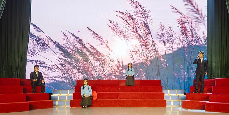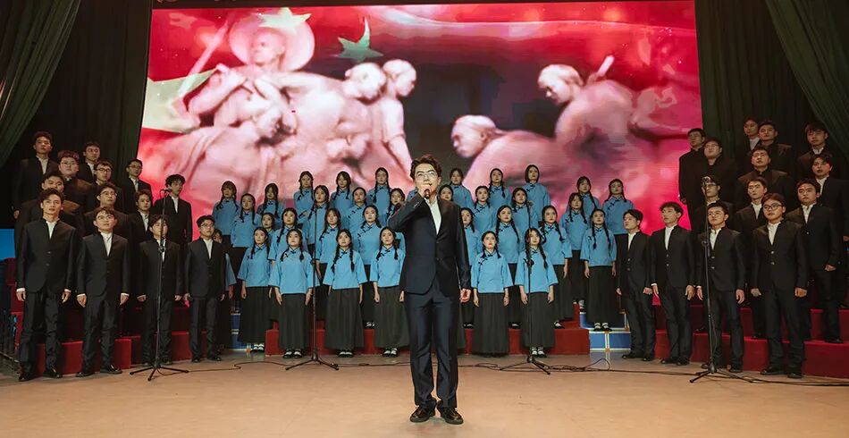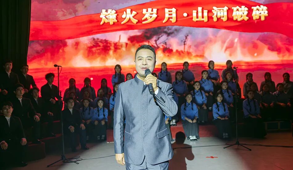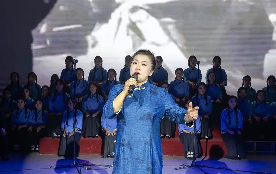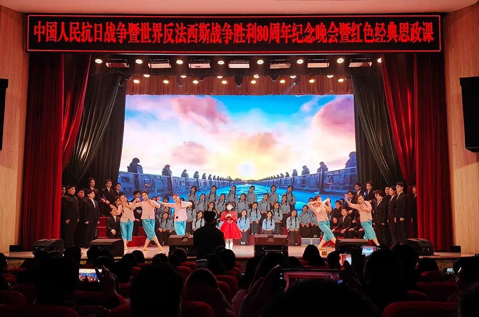 杨红英老师演唱的《弹起我心爱的土琵琶》,展现出革命者在艰难环境中依然保持的乐观主义与浪漫情怀;气势磅礴的合唱《保卫黄河》将中华民族誓死捍卫家园、捍卫民族尊严的坚强意志推向全场高潮;朗诵《民族的丰碑》铿锵有力,深情阐释伟大抗战精神在新时代的传承与弘扬。最后,全体演员与现场师生齐声高唱《没有共产党就没有新中国》,歌声嘹亮、振奋人心,表达了全体师生铭记历史、珍爱和平、开创未来,坚定不移跟党走的信念与决心。