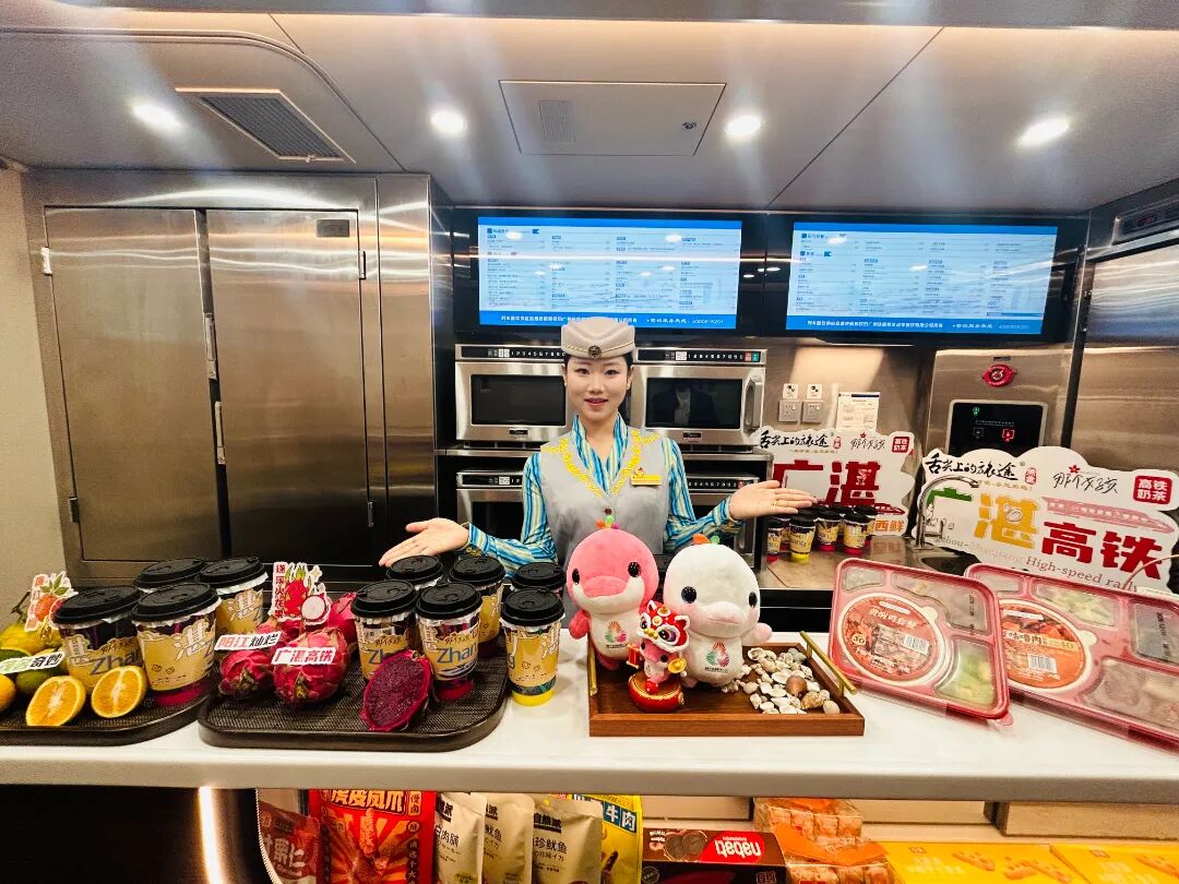 为了让这段旅程更具温度与质感,广湛高铁还精心打造了一系列特色服务举措:比如在每趟列车配备“便民服务箱”;为重点旅客提供一站式引导和帮助,还会在到站前主动提醒;语言沟通方面,除了普通话服务,我们的乘务员均熟练掌握基础粤语服务用语,用乡音拉近距离、传递温暖。