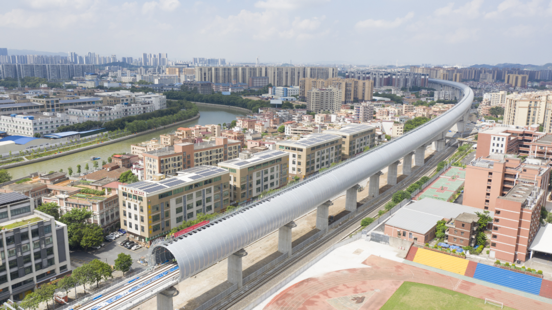 这座“隔音隧道”位于广湛高铁佛山段高中立交特大桥,桥梁全长约5100米,穿越佛山市中心城区。为最大限度降低列车噪声、振动对周边居民与生态环境的影响,建设团队在桥上架设了圆形全封闭声屏障,犹如为高铁线路装上“静音罩”。