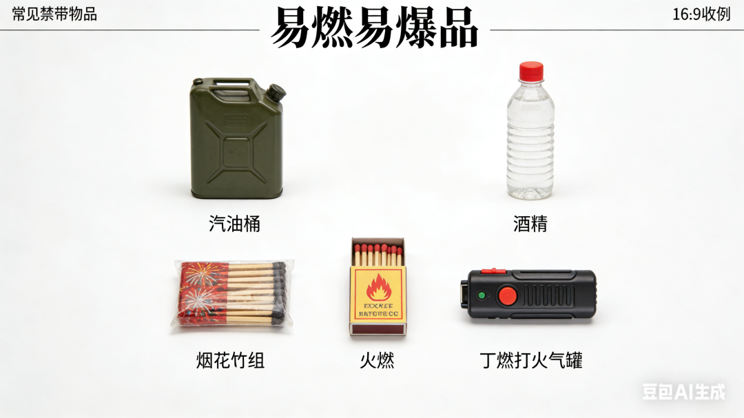 易燃易爆品:如汽油、酒精、烟花爆竹、打火机气罐等。