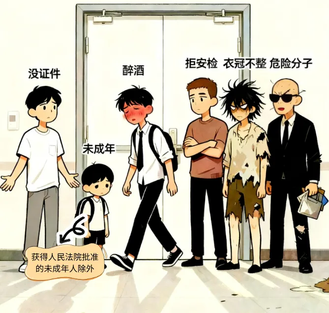 第十二条 下列人员不得进入诉讼场所:(一)无证件,伪造、冒用他人证件的人;(二) 未获得人民法院批准的未成年人;(三) 醉酒的人、精神病人或者其他精神状态异常的人;(四)拒绝接受安全检查或者不听从安全检查人员安排的人;(五)衣着不整、着装不文明的人;(六)其他可能危害法院安全或者妨害诉讼秩序的人。