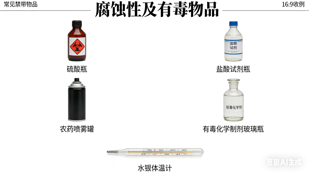 腐蚀性及有毒物品:如硫酸、盐酸、农药、有毒化学制剂等。