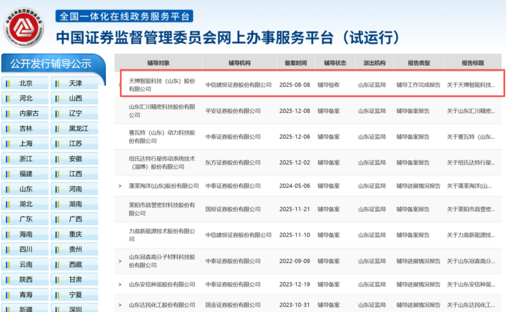 12月11日,证监会网上办事服务平台显示,天博智能科技(山东)股份有限公司(下称“天博智能”)IPO辅导状态变更为“辅导验收”,这意味着天博智能IPO进程再进一步。