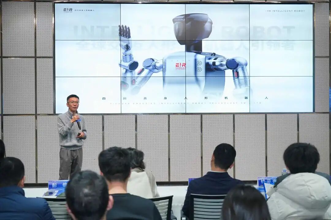 在分享环节,电子科技大学教授、博士生导师,四川具身人形机器人科技有限公司创始人、董事长彭倍结合智能机器人领域的科研与产业化实践作了主题分享。川投智胜、藤野科技、译讯科技三家企业进行了项目路演,展示其在数据要素与大模型融合、高端仪器仪表创新及人工智能技术出海等方面的成果。