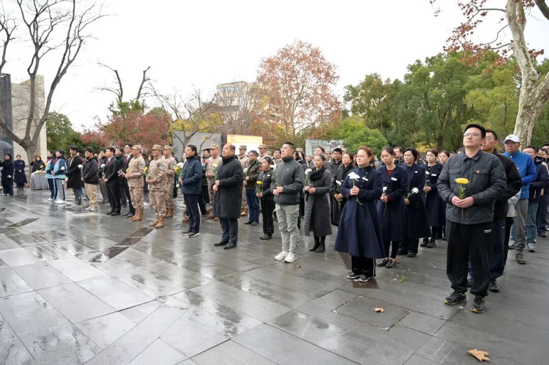 上午10时,仪式在雄壮的国歌声中开始。社会各界代表向先烈敬献花圈,全场肃立,默哀一分钟,共同缅怀在南京大屠杀中不幸遇难的同胞以及在抗日战争中英勇牺牲的革命先烈和民族英雄。来自上海市宝山区淞谊实验学校、上海电力大学的师生代表,上海市宝山区人民法院、上海汉未央传统文化促进中心的代表以及社会各界人士约200人,手持白菊,依次向无名英雄纪念碑敬献鲜花,表达哀思。