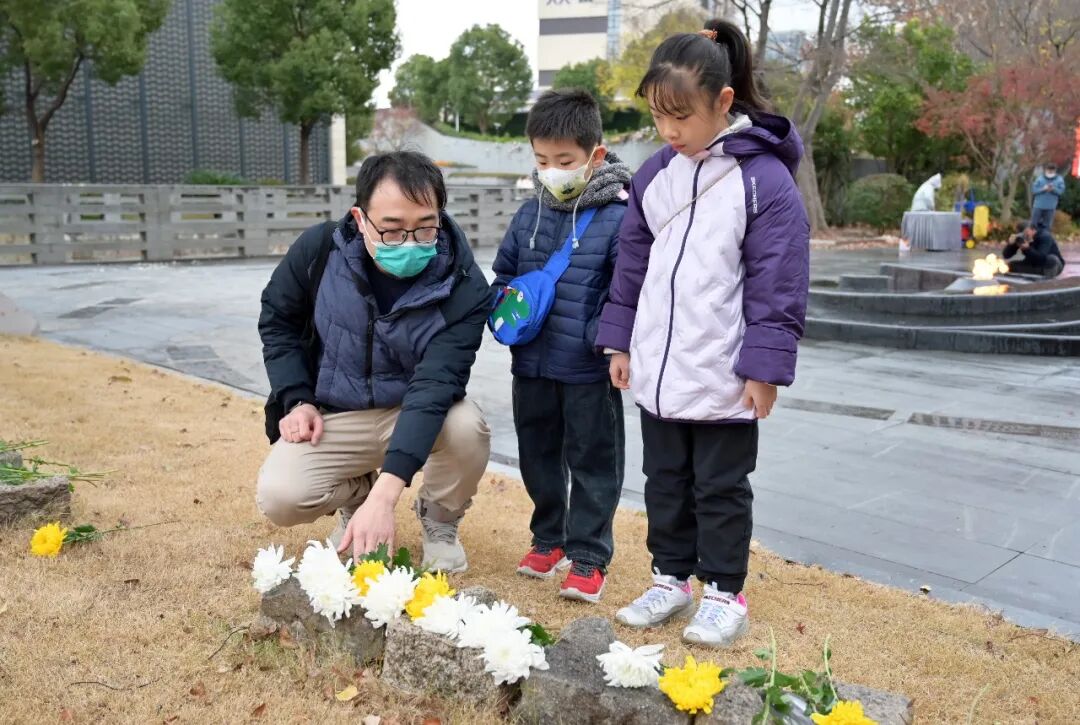市民张先生今天特地带着两个孩子来参加了悼念活动,并向他们讲述了这段惨痛的历史。他表示,“虽然去不了南京,但可以带孩子来这里瞻仰先烈,让他们了解今天和平幸福的生活来之不易,接受一次深刻的爱国主义教育。”
