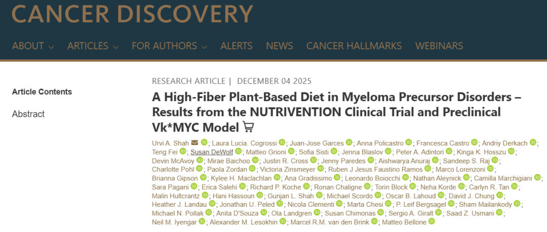 ①Shah, U. A., Cogrossi, L. L., et al, A High-Fiber Plant-Based Diet in Myeloma Precursor Disorders - Results from the NUTRIVENTION Clinical Trial and Preclinical Vk*MYC Model. 2025-12-04 , doi: 10.1158/2159-8290.CD-25-1101