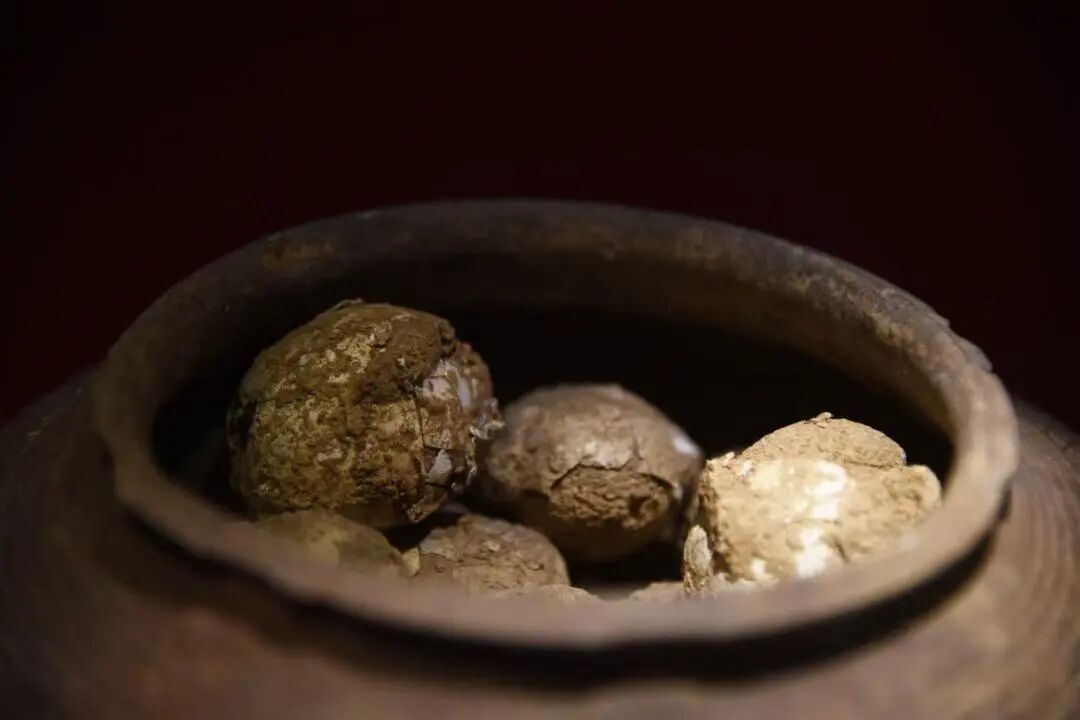 因为年代久远,鸡蛋早已与罐内泥土融合成“蛋形石化体”,为了保护这脆弱的遗存,考古专家没有将鸡蛋取出,让它们至今仍保持着出土时的模样,成了跨越2800年的时空见证。