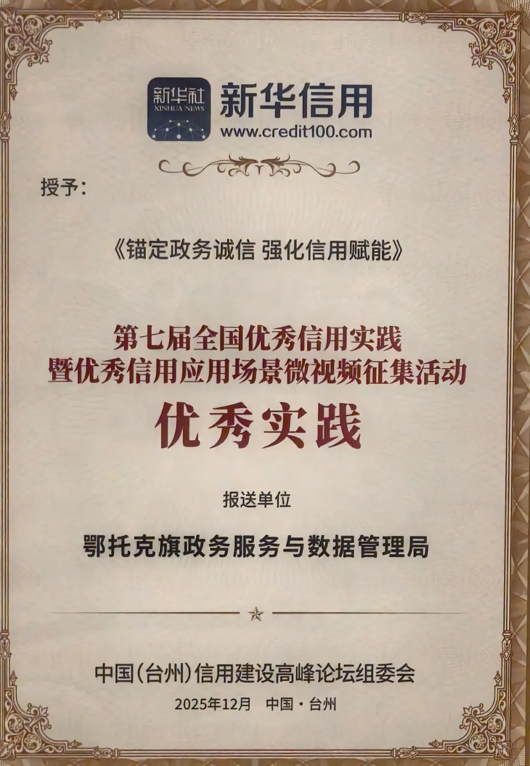 12月13日,第七届中国城市信用建设高峰论坛在浙江台州盛大启幕。由鄂托克旗政数局报送的“锚定政务诚信 强化信用赋能”案例,凭借扎实的实践成效与突出的创新特色,在众多参评案例中崭露头角,成功获评“全国信用应用场景优秀实践案例”。详情>>>
