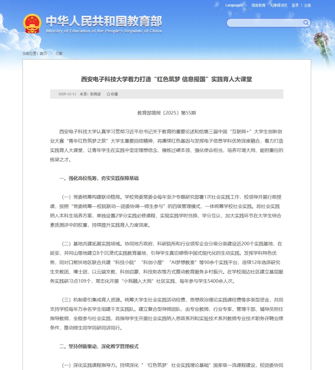 近日,教育部简报〔2025〕第55期以《西安电子科技大学着力打造“红色筑梦 信息报国”实践育人大课堂》为题,刊发西电将红色基因与电子信息学科优势深度融合,系统打造实践育人大课堂的创新做法与扎实成效。