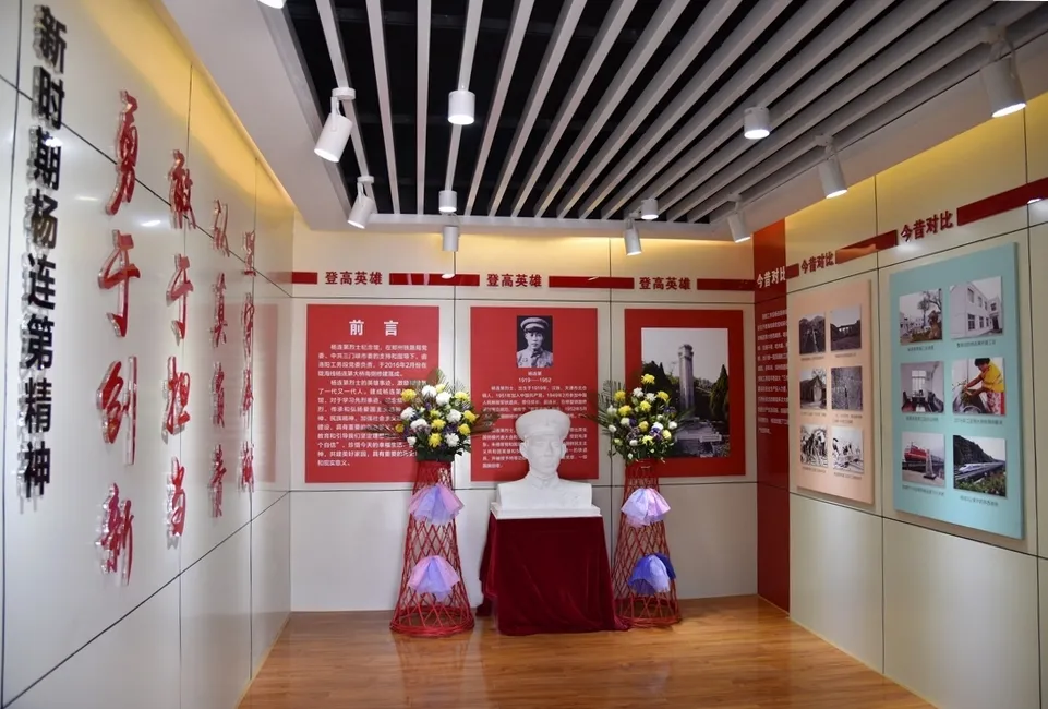 馆内陈列内容分为“投身革命、献身朝鲜、缅怀英烈、传承精神、今夕对比”五部分,通过图版、文字和实物展柜的形式,详细介绍了杨连弟烈士波澜壮阔的革命历史。实物展柜展存有杨连弟上行桥墩上的铁夹板、老信号灯、桥梁作业工具等43件珍贵物品。