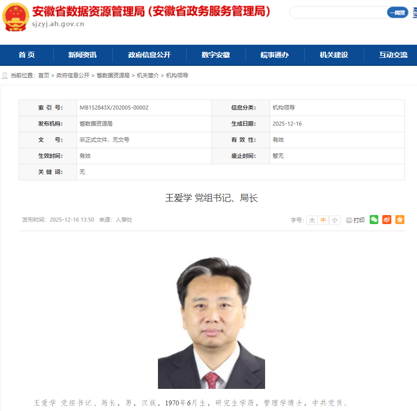 据安徽省数据资源管理局(省政务服务管理局)官网12月16日更新显示:王爱学已任安徽省数据资源管理局(省政务服务管理局)党组书记、局长。