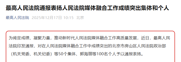 最高人民法院通报表扬人民法院媒体融合工作成绩突出集体和个人