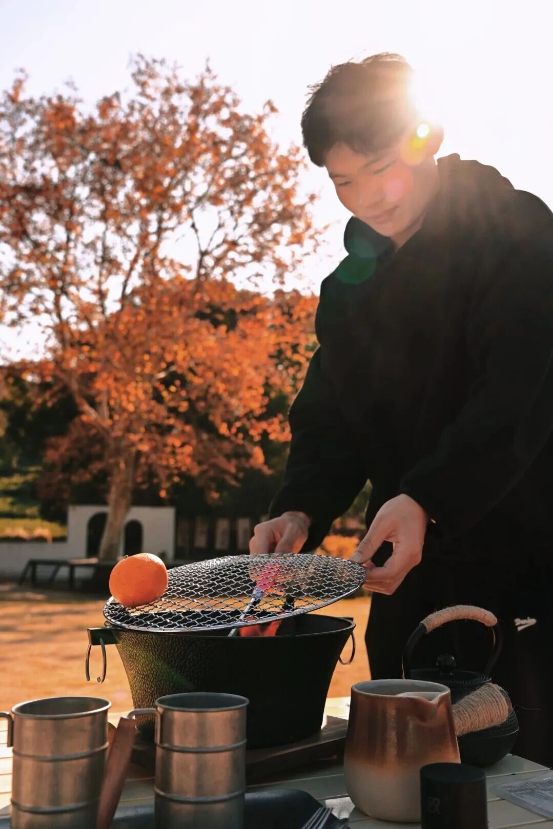 冷风总能催生睡意,但这里到底还是热闹的。梧桐树下,游人拍照打卡,笑语随着落叶轻轻飘转;树前的草坪上,已有人摆开茶具与小炉,炭火暖红,茶汤滚沸,闲谈声里漫起袅袅的香。