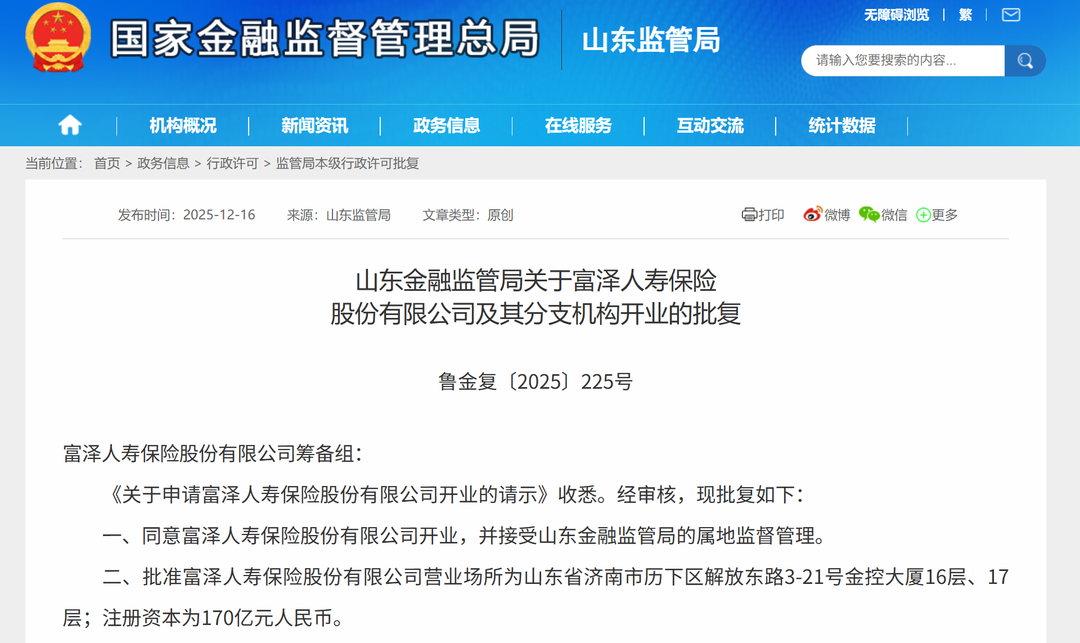 据相关批复显示,同意富泽人寿开业,并接受山东金融监管局的属地监督管理。