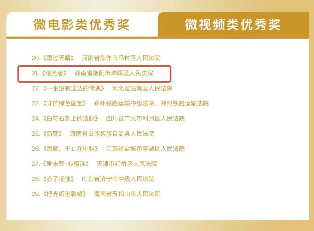 由最高人民法院主办的第十二届“金法槌”微电影微视频征集展播活动获奖名单今日正式公布,衡阳市珠晖区人民法院报送的微视频《绘光者》从全国31个省(自治区、直辖市)1580部作品中脱颖而出,荣获微视频类优秀奖!
