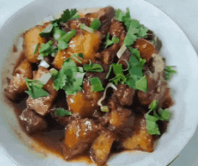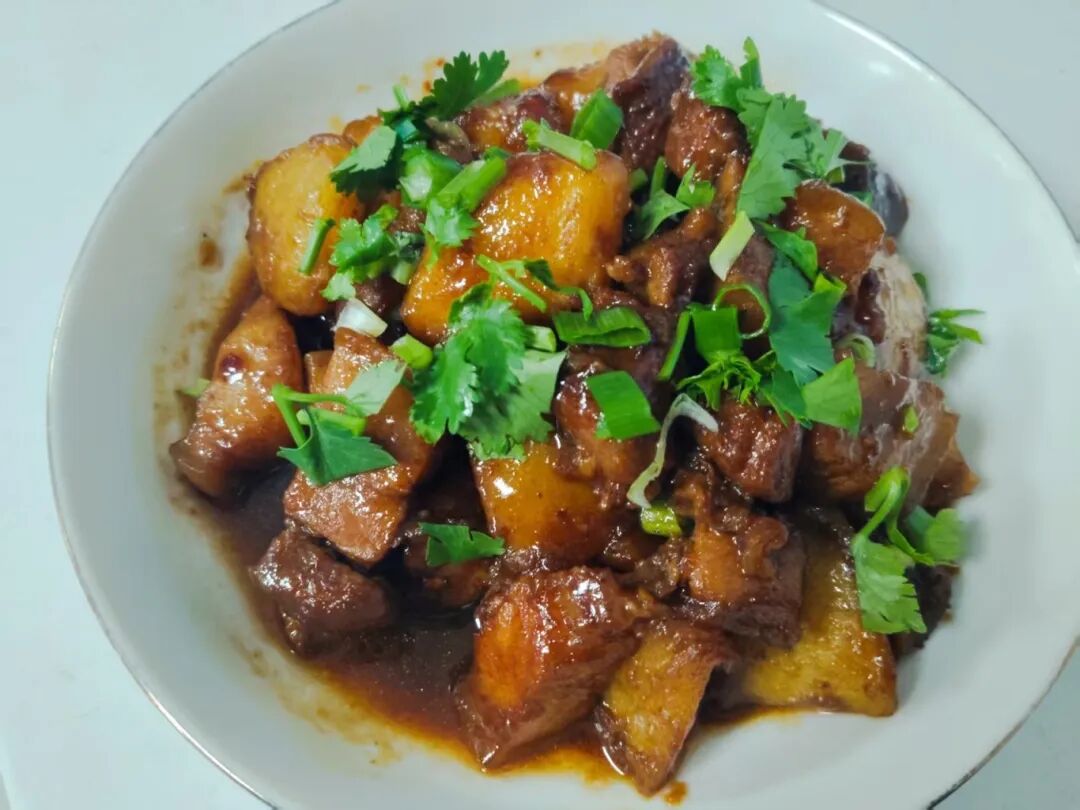 咸甜在舌尖交织,入口先是酱油的醇厚咸香,后是冰糖的温润回甘,软糯香醇,不腻不柴。肉块肥瘦相间,经慢炖后外皮红亮油润,内里肉质酥软,汤汁拌饭,迅速恢复体力投入工作状态。