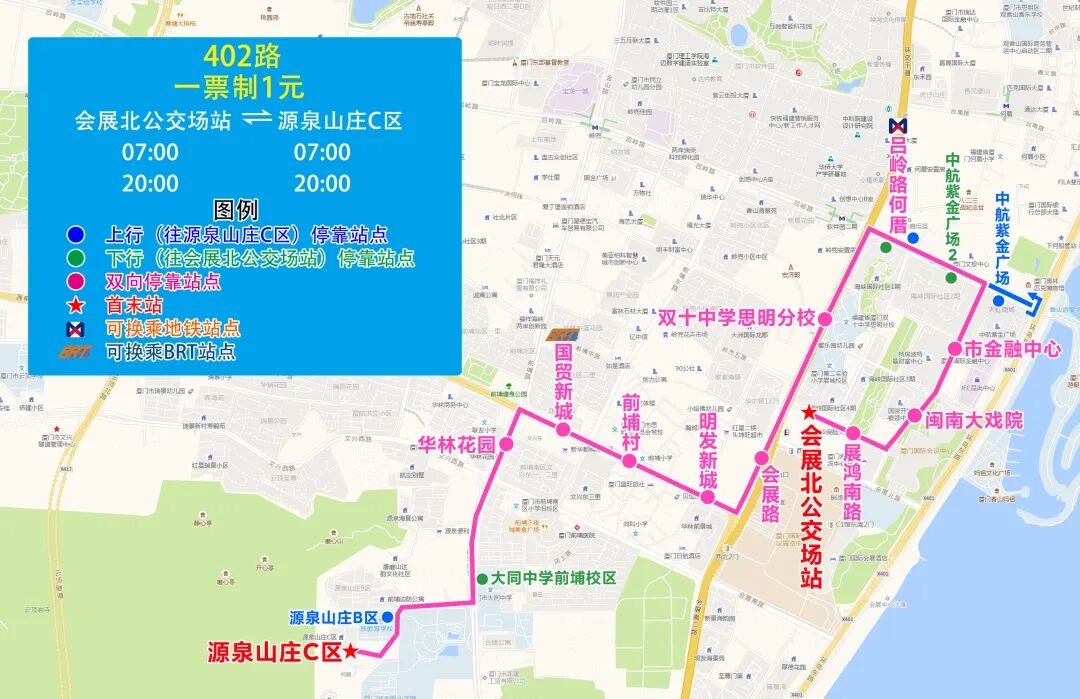会展北公交场站、展鸿南路、闽南大戏院、市金融中心、中航紫金广场(往源泉山庄)、中航紫金广场2(往会展北)、吕岭路何厝、双十中学思明分校、会展路、明发新城、前埔村、国贸新城、华林花园(往源泉山庄);
