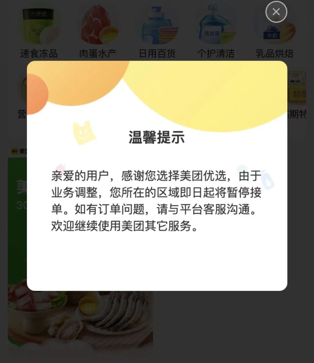 美团优选是美团旗下社区团购,采取“预购+自提”的模式,早在今年6月23日,就已在全国大面积关停,不过当时,广东、浙江等区域还在持续运营。