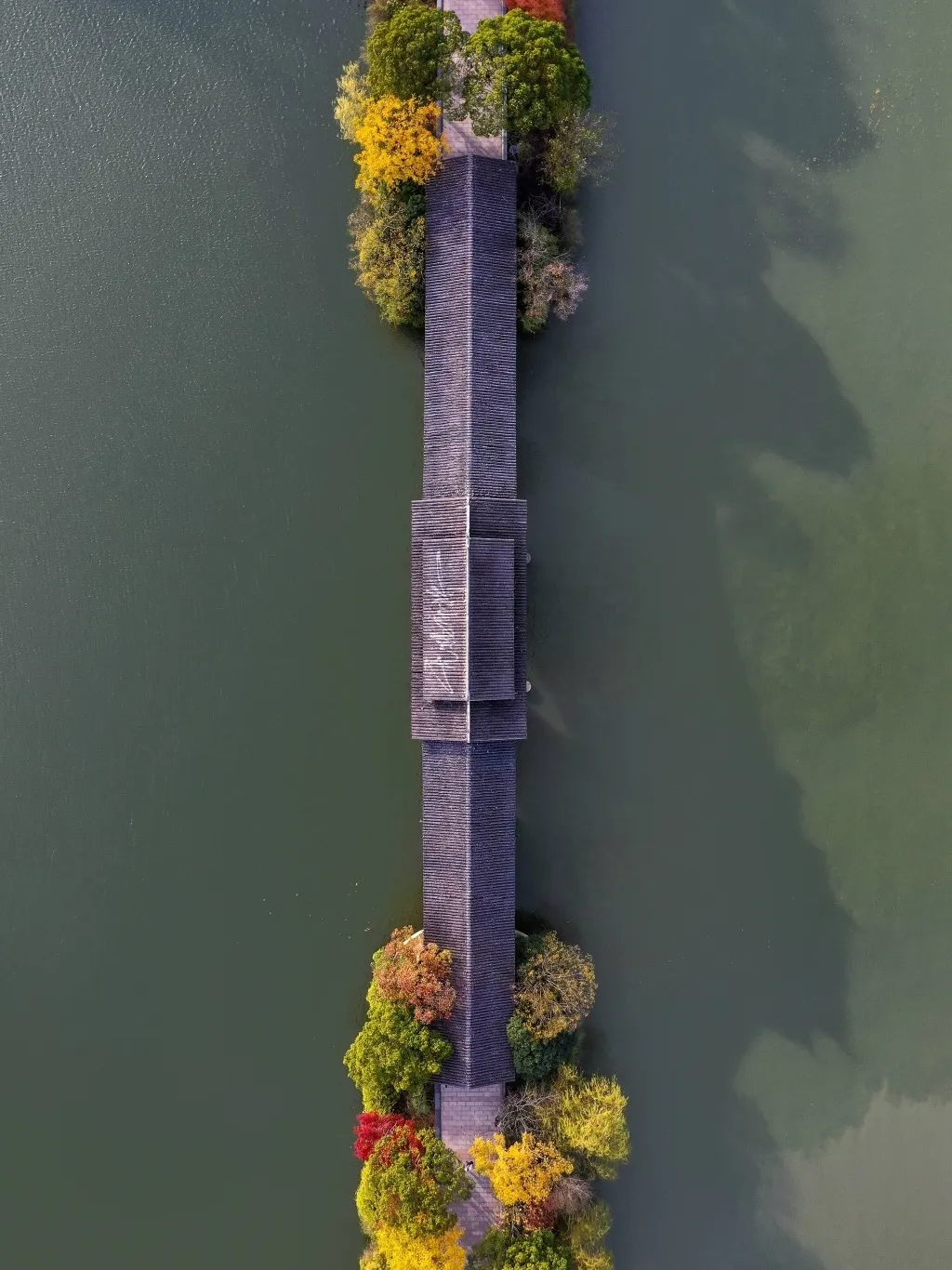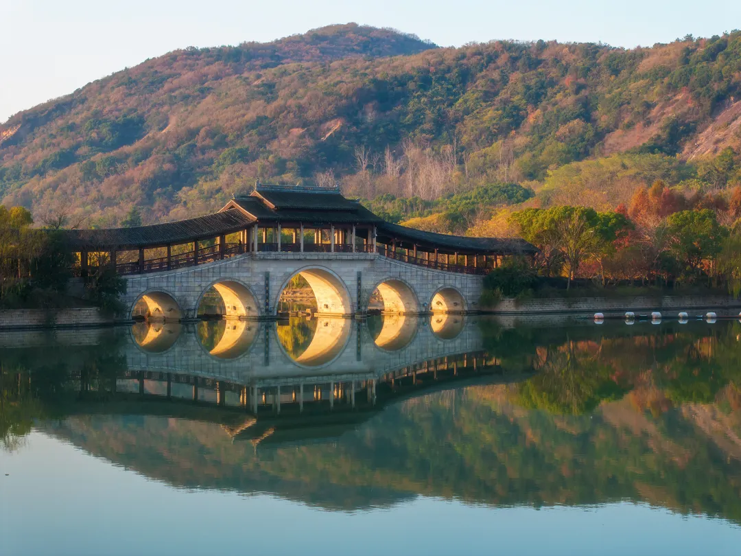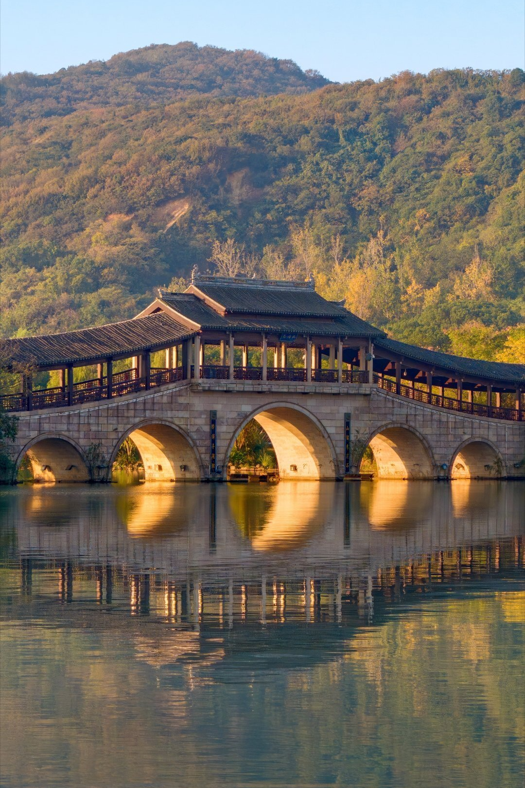 橙黄色的阳光顺次穿过石塘廊桥