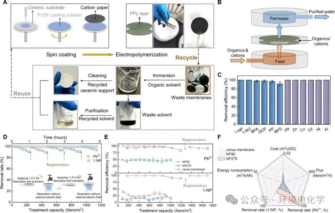 饮用水中的微量污染物是全球性环境问题。膜分离是少数能去除水中微量污染物的方法之一,但现有膜在同时高效去除小分子有机物和离子污染物方面面临挑战。本研究提出一种低压力Janus膜,其具有电诱导多亲和界面,通过疏水作用和静电作用,单次过滤即可同时去除多种有机物和重金属,去除率近100%,水通量高达 >680 L·m⁻²·h⁻¹,能耗比商业纳滤膜低98%。电诱导界面亲和性切换可实现膜性能100%再生,为可持续饮用水净化提供了新途径。