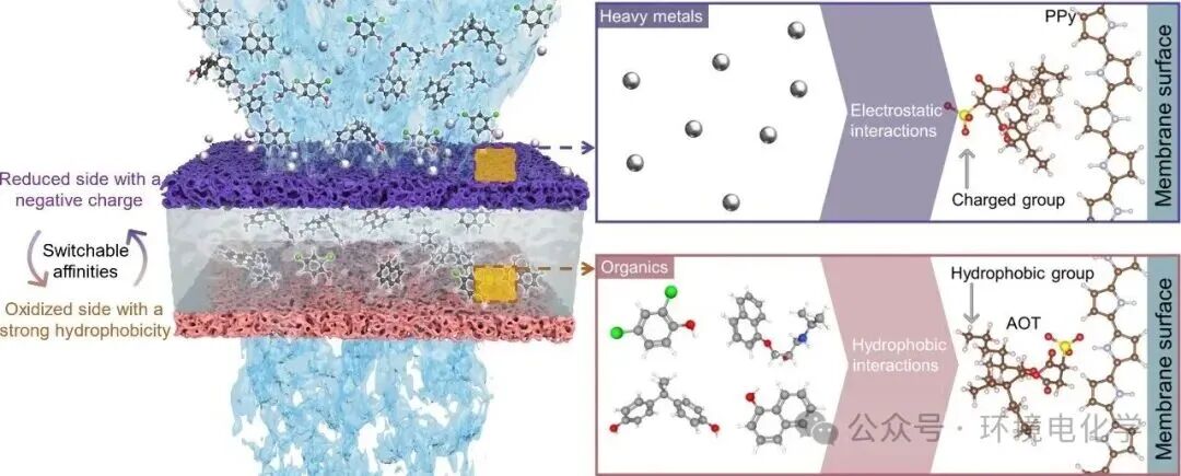 本研究设计了一种电响应Janus膜,通过在聚吡咯(PPy)层中掺杂两亲性分子AOT,利用电化学氧化还原反应调控膜表面性质:氧化侧暴露疏水烷基链,用于吸附有机物;还原侧暴露带负电的磺酸根,用于吸附重金属。该膜在单次过滤中实现近100%去除率,且可通过短暂电刺激实现原位再生,无需化学添加剂。膜性能优于商业纳滤膜和活性炭柱,具备高通量、低能耗、低成本回收等优势。