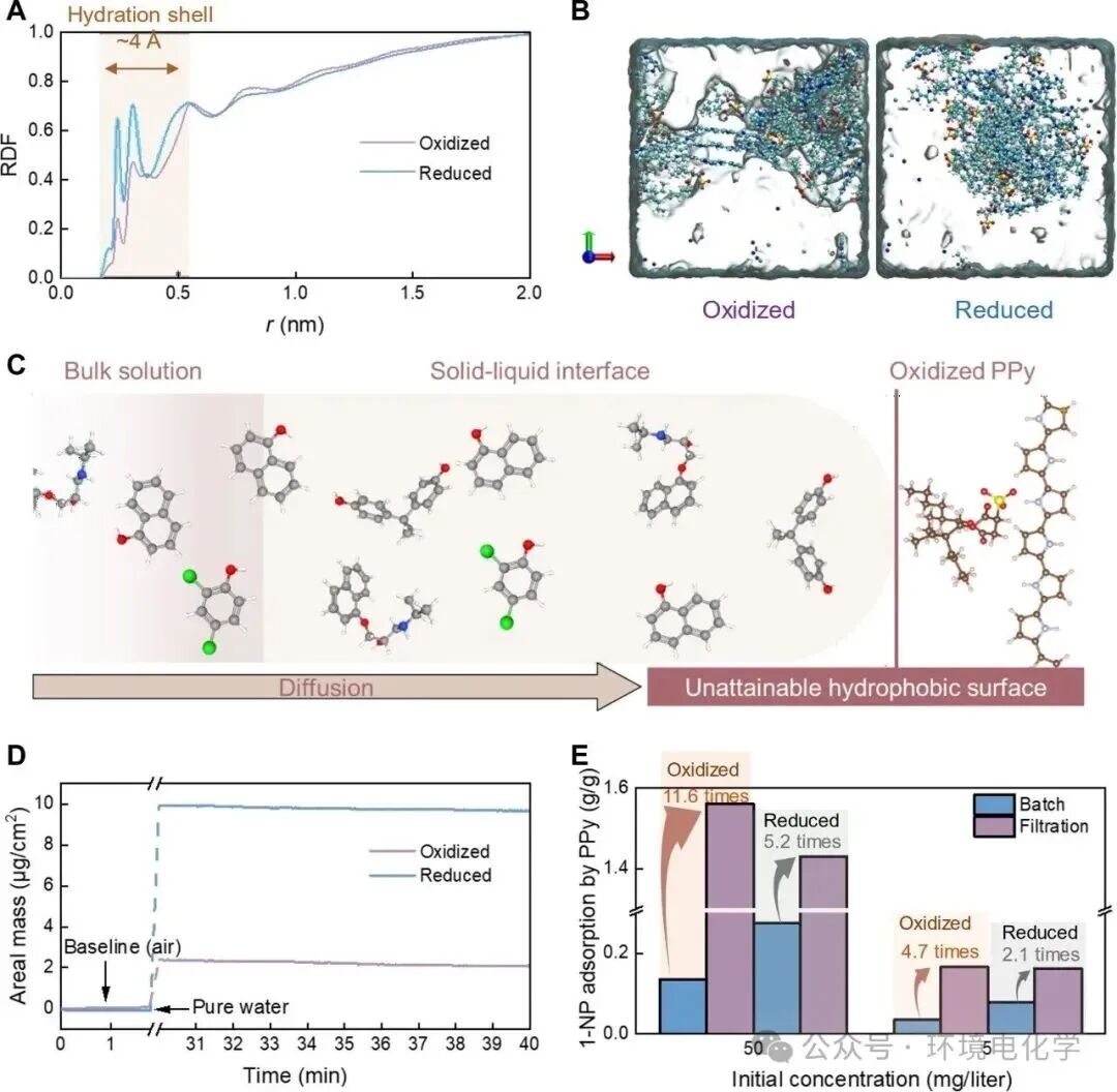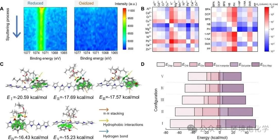 3C–D:通过理论计算揭示PPy-AOT与1-NP之间的π-π堆积、疏水作用、氢键等非共价相互作用。