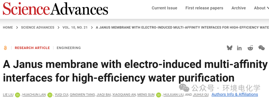 原标题:《Science Advances | 清华大学兰华春团队:电控可再生Janus膜!实现氧化/还原双功能,高效去除有机物和重金属!》