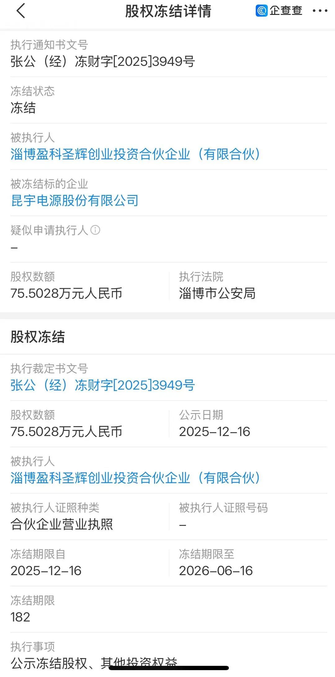 企查查信息显示,12月16日,因淄博盈科圣辉创业投资合伙企业(有限合伙)成为被执行人,昆宇电源股权被淄博市公安局冻结,冻结权益数额为75.5万元,冻结期限从2025年12月16日至2026年6月16日。
