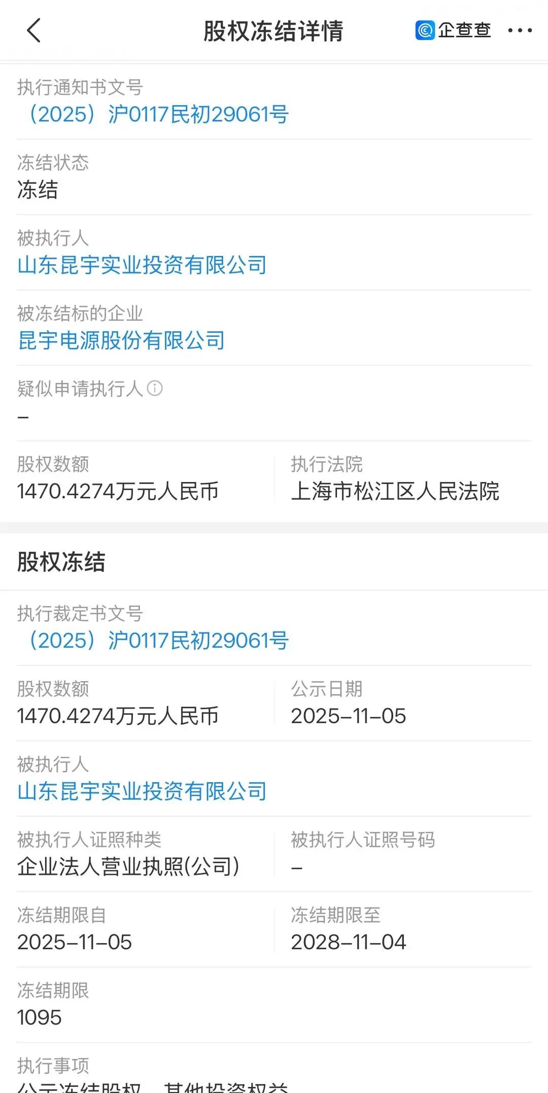 11月5日,因控股股东山东昆宇实业投资有限公司成为被执行人,上海市松江区人民法院冻结昆宇电源股权,冻结权益数额为1470.42万元,冻结期限从2025年11月5日到2028年11月4日。