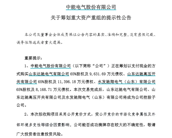 近日,中能电气公告,正筹划以支付现金方式购买山东三家公司65%股权及债权,交易底价分别为4.71亿元、1.91亿元、1.95亿元,合计8.57亿元,全部以自筹资金支付,可能构成重大资产重组。
