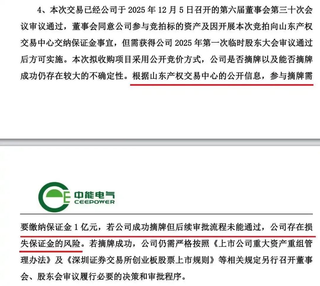 值得注意的是,真正引发争议的是支付流程。中能电气表示,根据山东产权交易中心公开信息,参与摘牌需缴纳保证金1亿元,若中能电气成功摘牌但后续审批流程未能通过,存在损失保证金的风险。