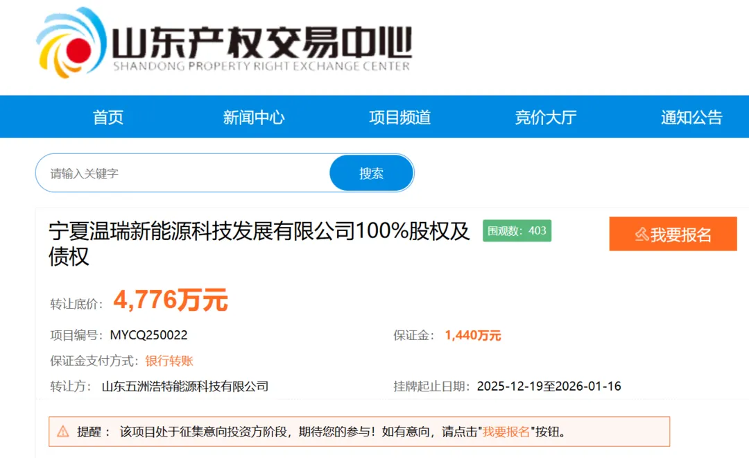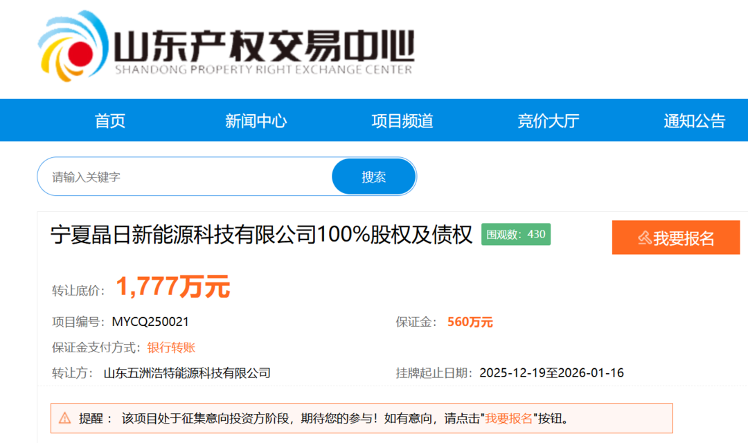 12月19日,山东五洲浩特能源科技有限公司(下称“山东五洲浩特”)在山东产权交易中心同时转让两家宁夏企业。其中,宁夏温瑞新能源科技发展有限公司(下称“宁夏温瑞新能源”)100%股权及债权转让底价4776万元,宁夏晶日新能源科技有限公司(下称“宁夏晶日新能源”)100%股权及债权转让底价1777万元。