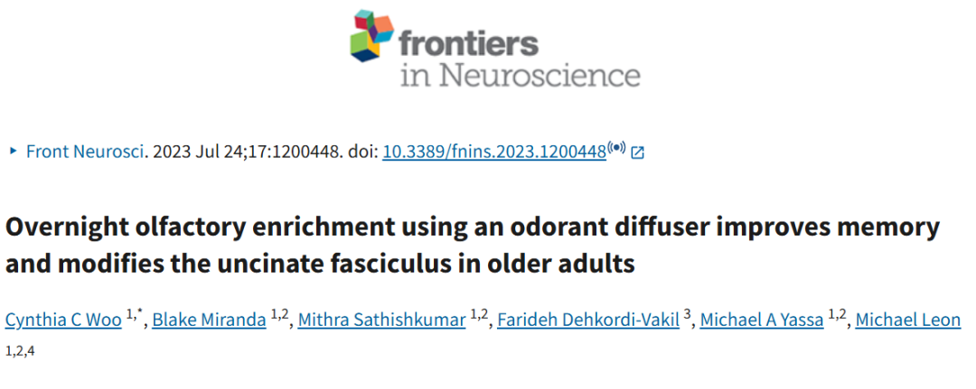⑥Woo CC, Miranda B, Sathishkumar M, Dehkordi-Vakil F, Yassa MA, Leon M. Overnight olfactory enrichment using an odorant diffuser improves memory and modifies the uncinate fasciculus in older adults. Front Neurosci. 2023;17:1200448. Published 2023 Jul 24. doi:10.3389/fnins.2023.1200448