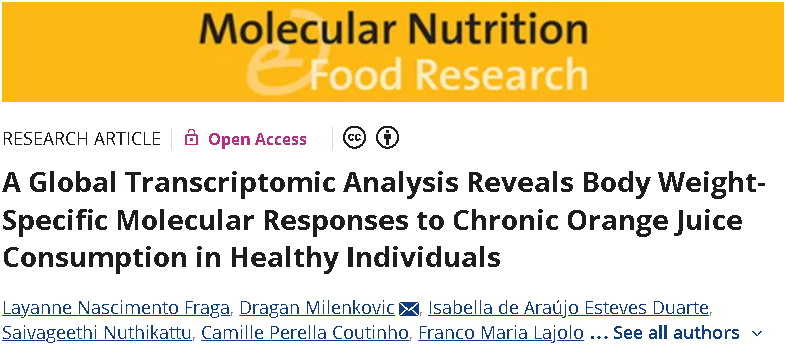 ①Fraga LN, Milenkovic D, Duarte IAE, et al. A Global Transcriptomic Analysis Reveals Body Weight-Specific Molecular Responses to Chronic Orange Juice Consumption in Healthy Individuals. Mol Nutr Food Res. 2025;69(24):e70299. doi:10.1002/mnfr.70299