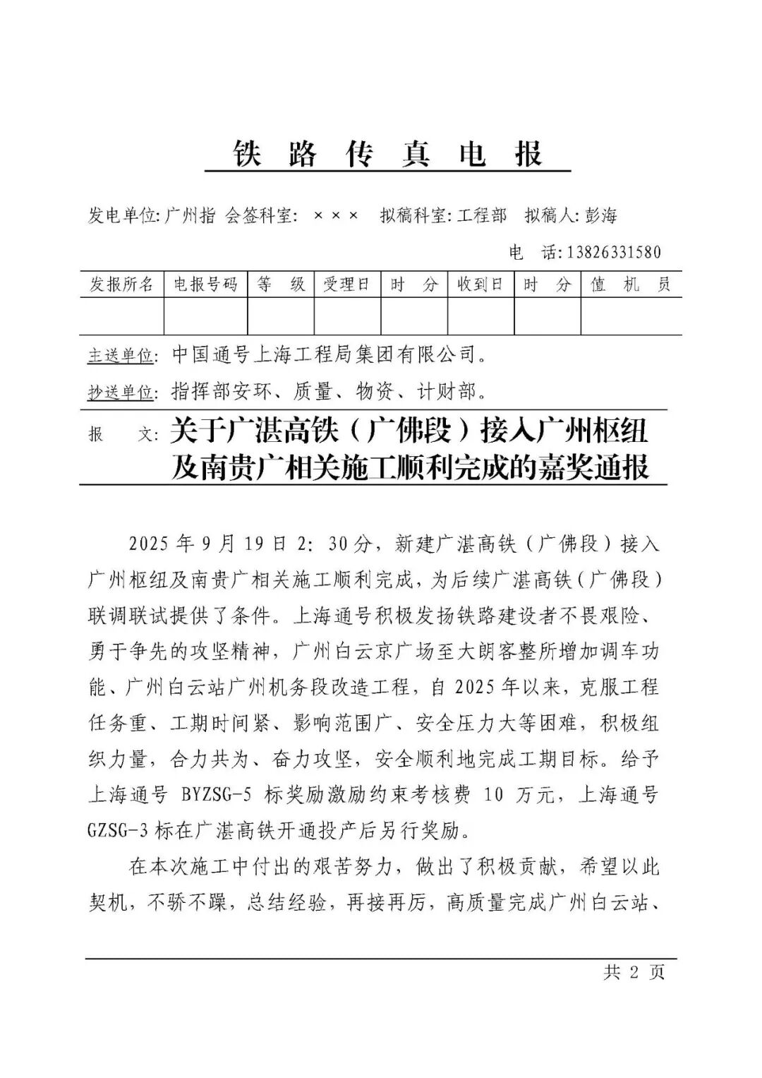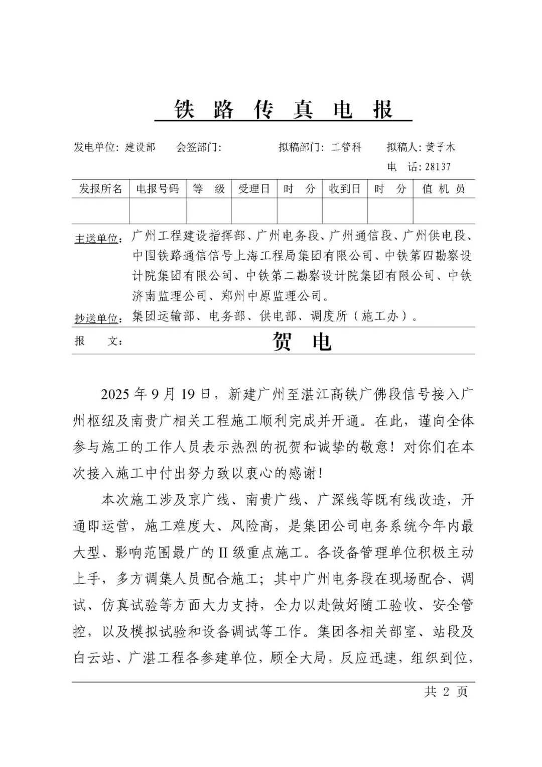 建设期间,在中国铁路广州局集团有限公司广州工程建设指挥部召开的2025年三季度安全质量评比表彰大会上,广湛高铁项目部凭借优质的安全管理与施工质量,荣获“优胜项目部”荣誉称号,其承建的DK11+860中继站1信号工程荣获“优秀工地”称号。